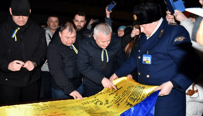 На перроне мероприятие длилось около 20 минут. После этого флаг забрали, а поезд уехал. Акция на этом не закончилась. Флаг должны передать морякам, которые перевезут его в Одессу. А оттуда он снова на поезде поедет в столицу. Его передадут Президенту Украины Владимиру Зеленскому.